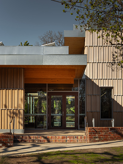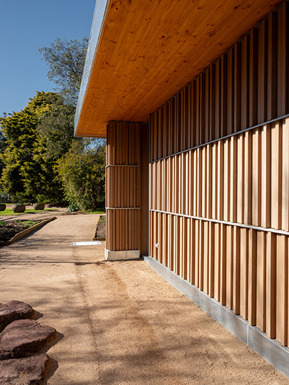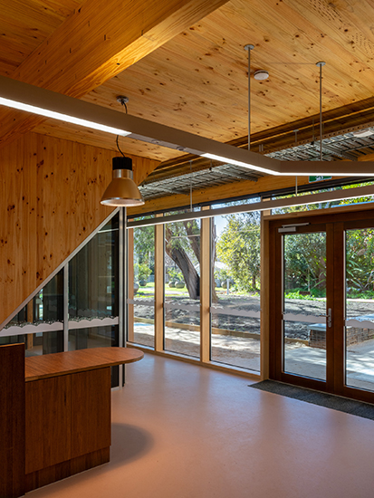 Designed to operate with net zero energy and water usage, the project is also targeting a 6 Star GBCA Green Star (as-built) rating. The building is embedded within the botanic gardens and camouflaged from views within the gardens with a trunk-like timber cladding. The building consists of a multi-purpose space, meeting rooms and commercial kitchen as well as staff offices and the first citizen science laboratory in the southern hemisphere. The specification of timber within the building has been scrutinised to ensure the provenance of the timber is not impacting biodiversity where it is farmed. The structure, services and materials used all aim to provide a ‘net positive’ effect on the environment.