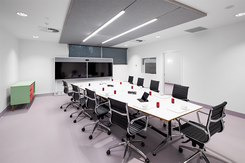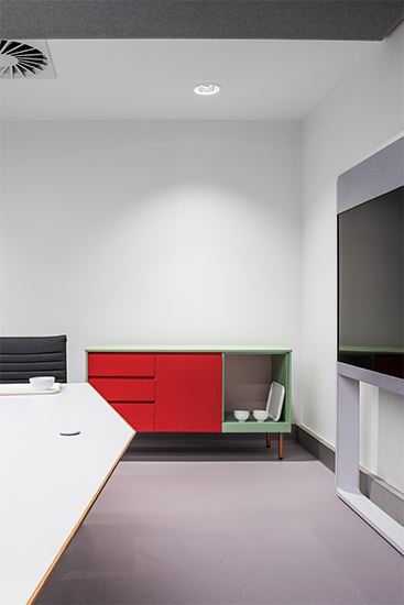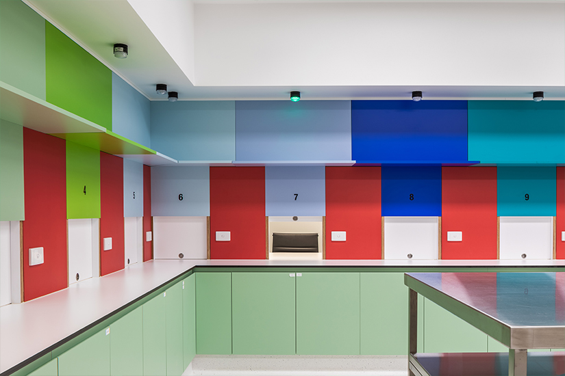 The specific nature of the muted colour of the test lab is emphasised with an opposing highly coloured joinery installation in the test kitchen, clearly delineating the two sides of the lab. The spatial relationships designed allow for flexibility of use and a flow between group briefing and testing or individual testing with clinical room for subject testing.