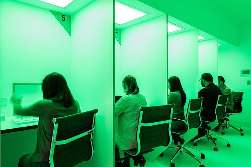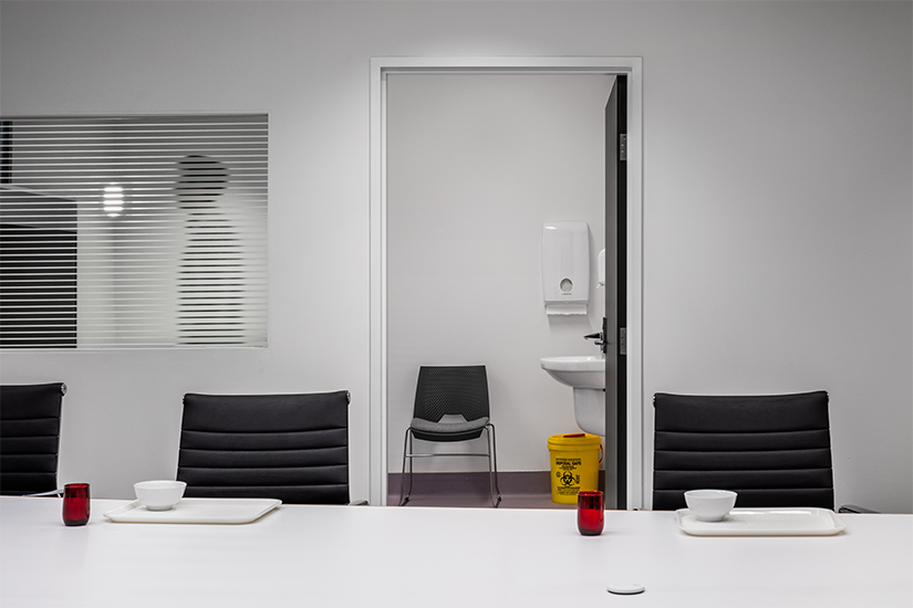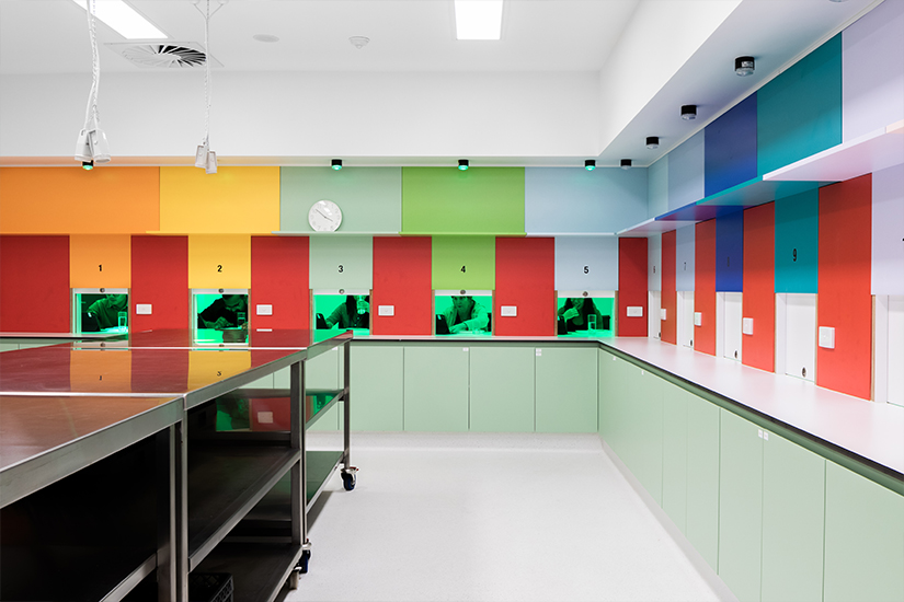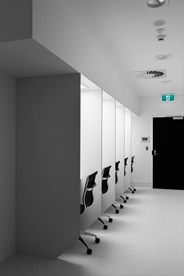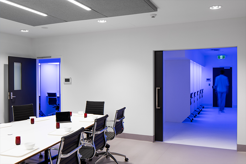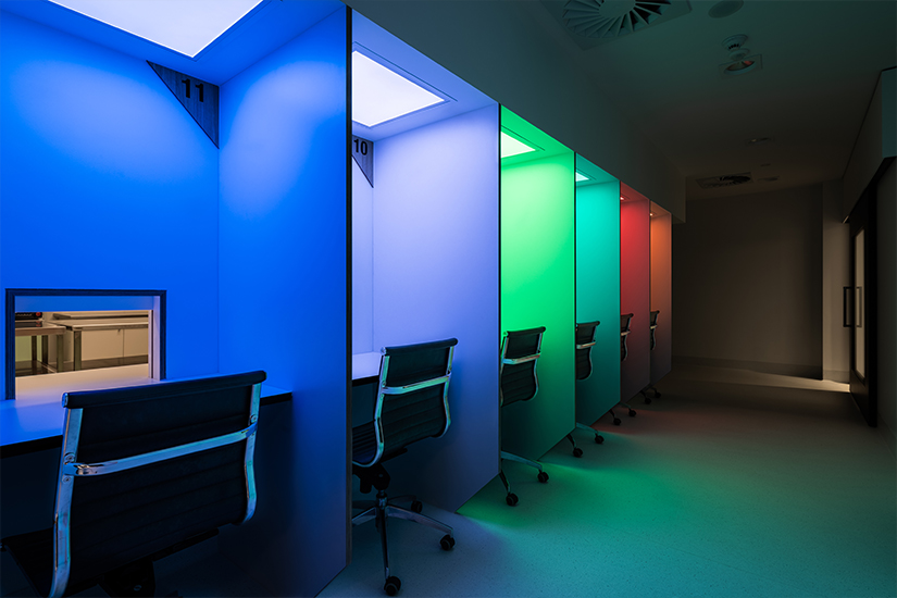The lab is designed in accordance with ISO 8589 for Sensory Analysis test rooms and to Biosecurity containment standards (for Department of Agriculture Water and Environment) as a Quarantine Approved Premises. The lab is designed with a minimal colour palette as required by the ISO standard together with colour tuneable LED lighting in booths to allow for masking of food samples.